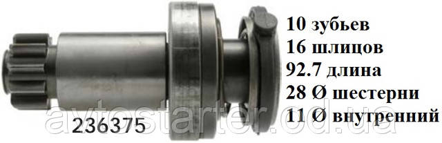 10 зубів, 16 шліців, довжина 93, діаметр шестерні 27.8, внутрішній діаметр 11, обертання ліве.