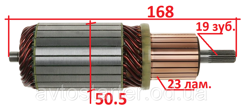 19 шліців, 23 ламелі для щіток, загальна довжина 168, зовнішній Ø 50.5