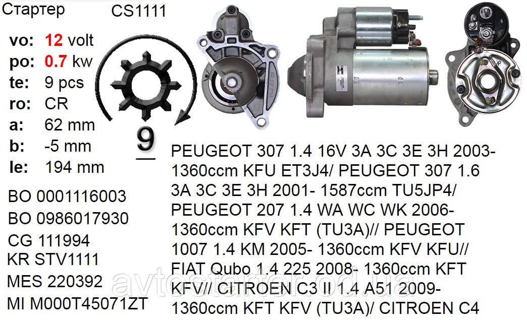 12V, 0.7 kW, Ø посадки 62, виліт бензокса -5, отворів для кріплення 3 (1 з різзю), 9 зубців на бендиксі, обертання якоря праве