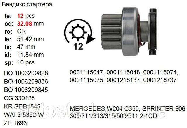 12 зубців, 10 шліців, довжина 51, Ø шестерні max 32, Ø внутрішній (вал якоря) 12, вільне обертання праве